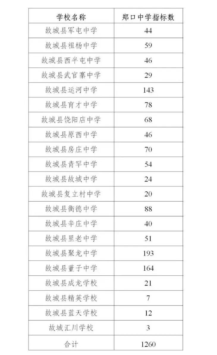 郑口中学招生计划1400人,其中,统招生占招生计划的10%,计140人,全县排名录取;指标生占招生计划的90%,计1260人,分配到各乡镇各初中。